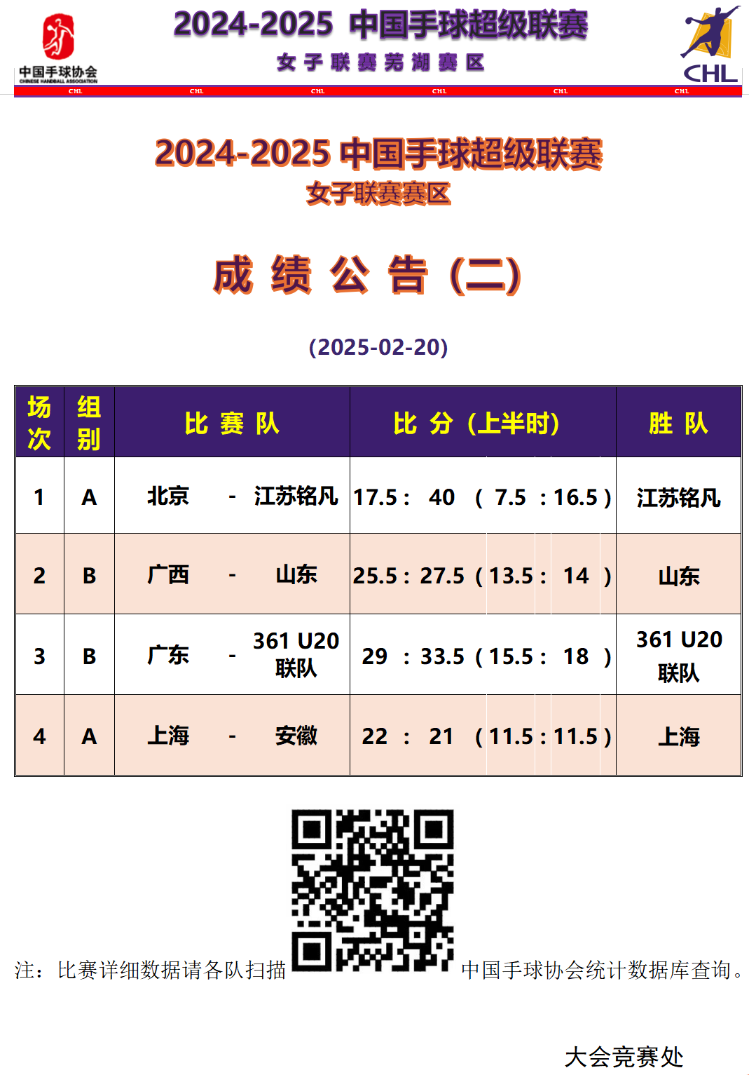 2024-2025中国手球超级联赛女子联赛芜湖赛区的比赛2月20日进行了小组第二轮的比赛。A组江苏铭凡队40比17.5轻取北京队获两连胜,上海队22比21逆转胜安徽队,两队都是一胜一负,北京队两负;B组361U20联队33.5比29战胜广东队,赢得两连胜,山东队以27.5比25.5击败广西队,山东队与广东队都是一胜一负,广西队为两负。
